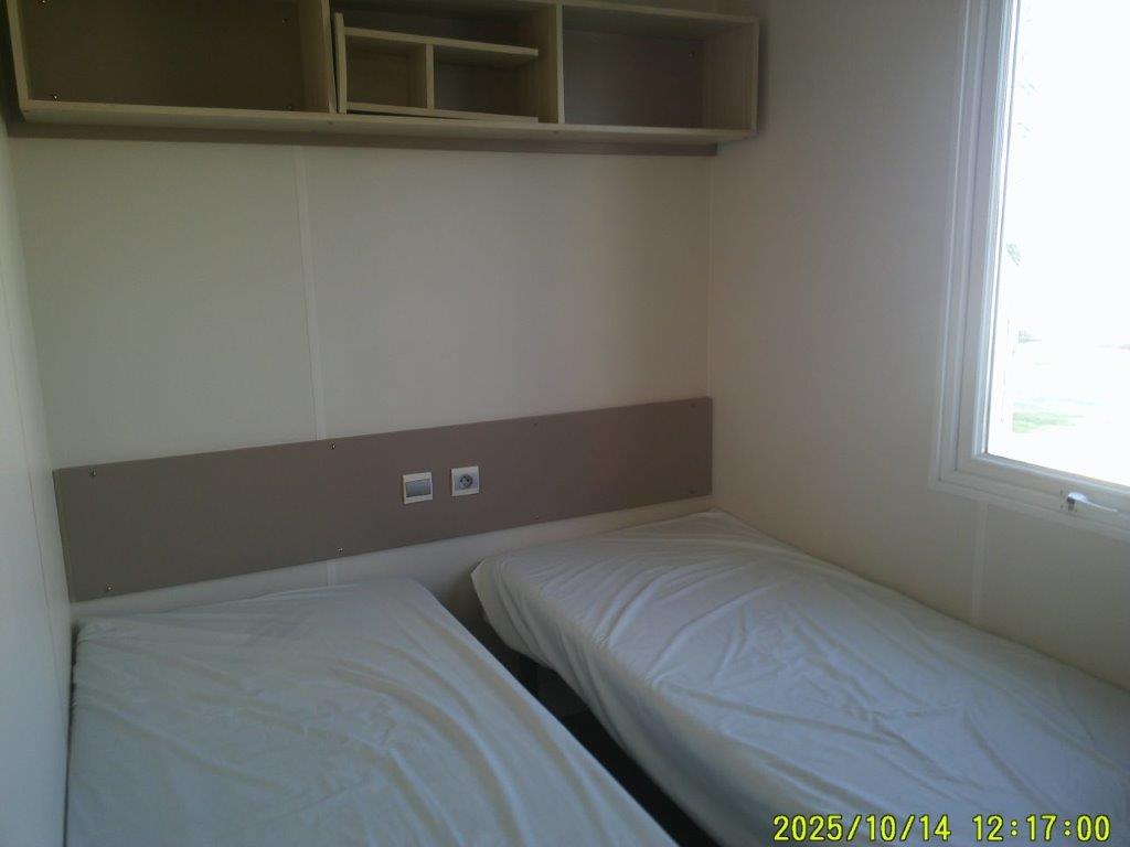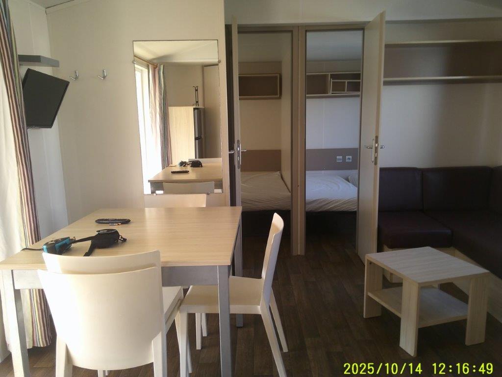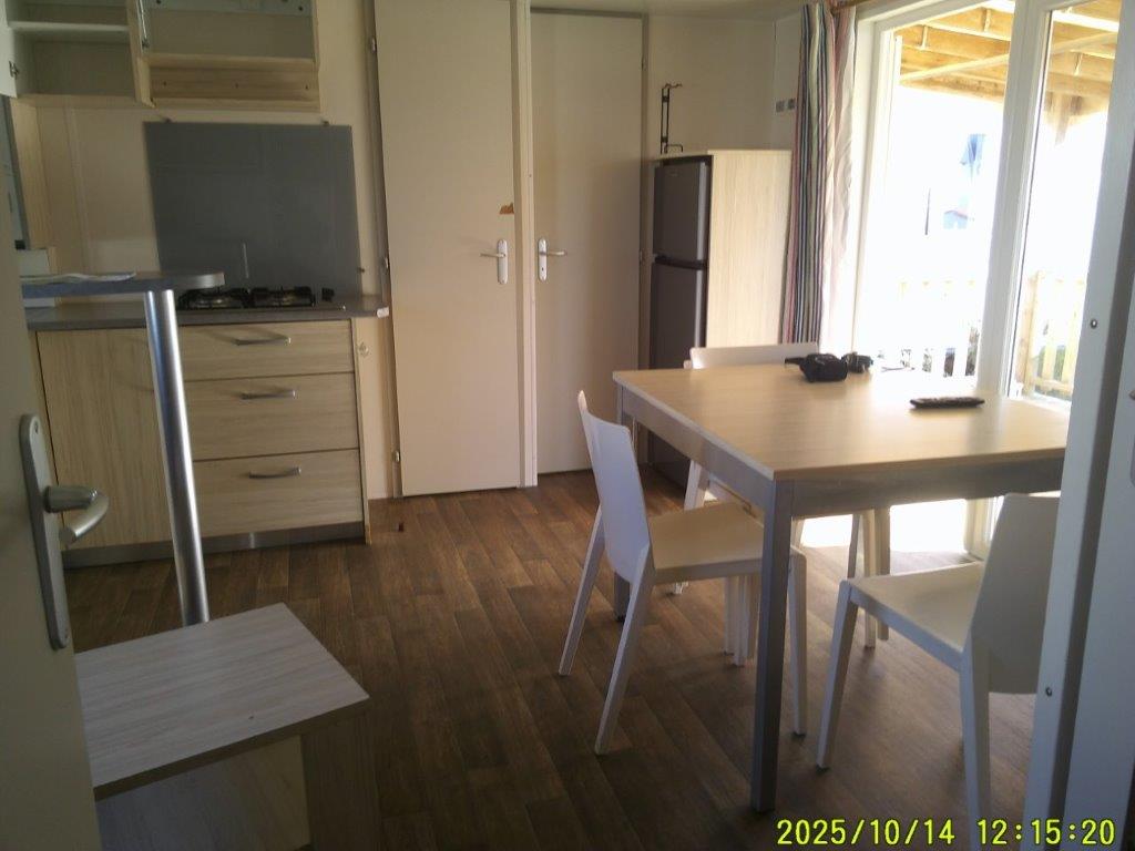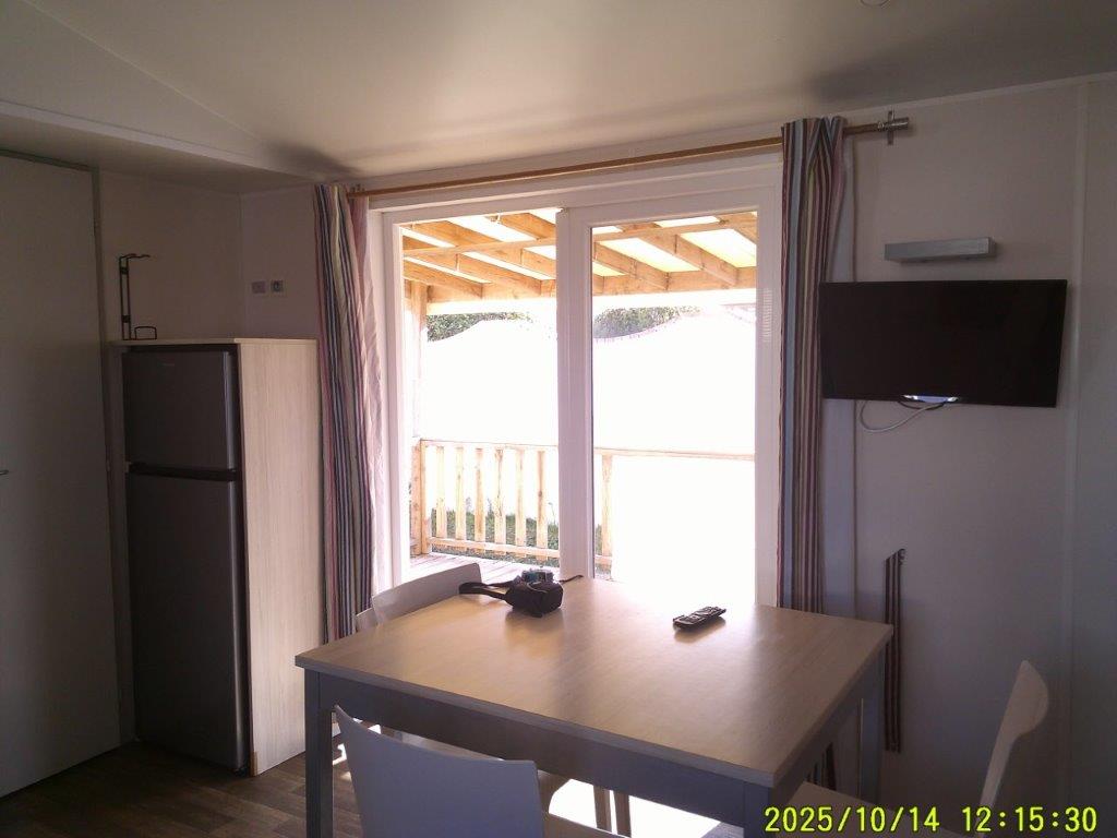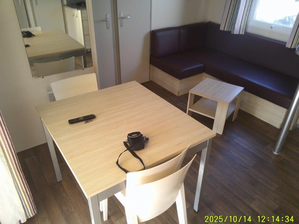 Ce mobile-home 4 Saisons, équipé de double vitrage, offre un confort optimal en toute période de l’année. L’espace de vie s’articule autour d’un salon central très lumineux grâce à une grande baie vitrée, aménagé avec une table et 4 chaises. Chaque pièce bénéficie d’un convecteur, garantissant une température agréable en toutes saisons.